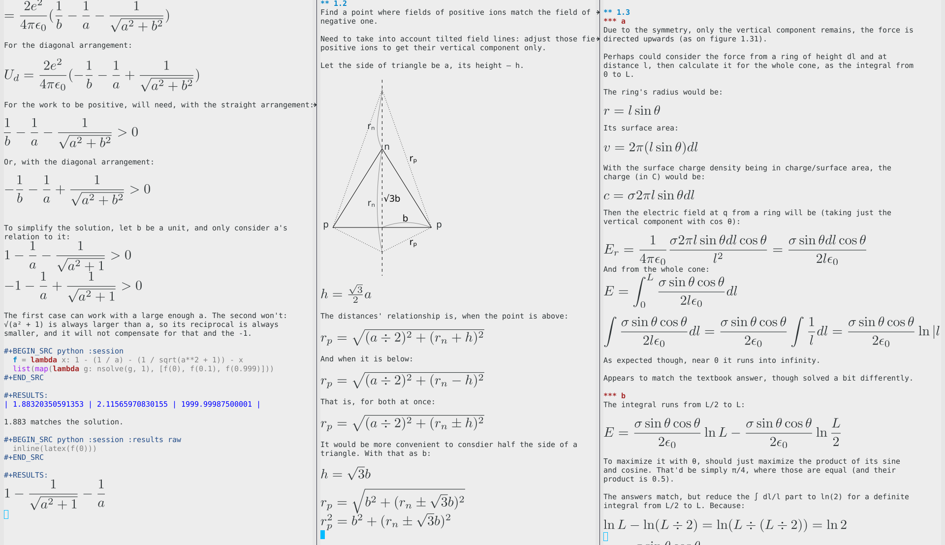 I used to assume that LaTeX would be cumbersome to use for actual problem solving, yet it turned out to be handy with preview-latex, at least while touch typing and having some previous experience with LaTeX. Later, with a newer org-mode version and on Debian, I only had to configure org-mode's built-in LaTeX preview and CDLaTeX mode for snippets. Org is also convenient for embedding executable code adn its results, particularly for solving equations numerically, calculating series, evaluating integrals with SymPy, Octave (and its symbolic package), or similar systems. The relevant org-mode configuration: